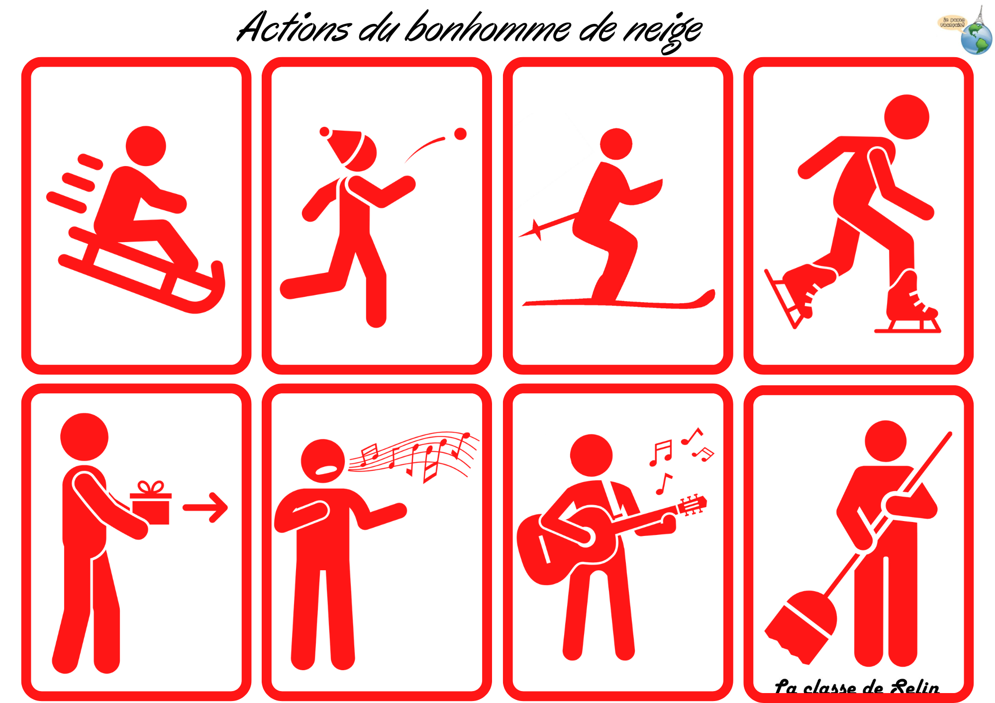 skier, patiner, faire de la luge, balayer, boire un chocolat chaud, lancer une boule de neige, offrir un cadeau, faire des biscuits, lire une lettre, lire un livre, chanter, manger un sucre d'orge, conduire une voiture, jouer de la musique, jouer au ballon