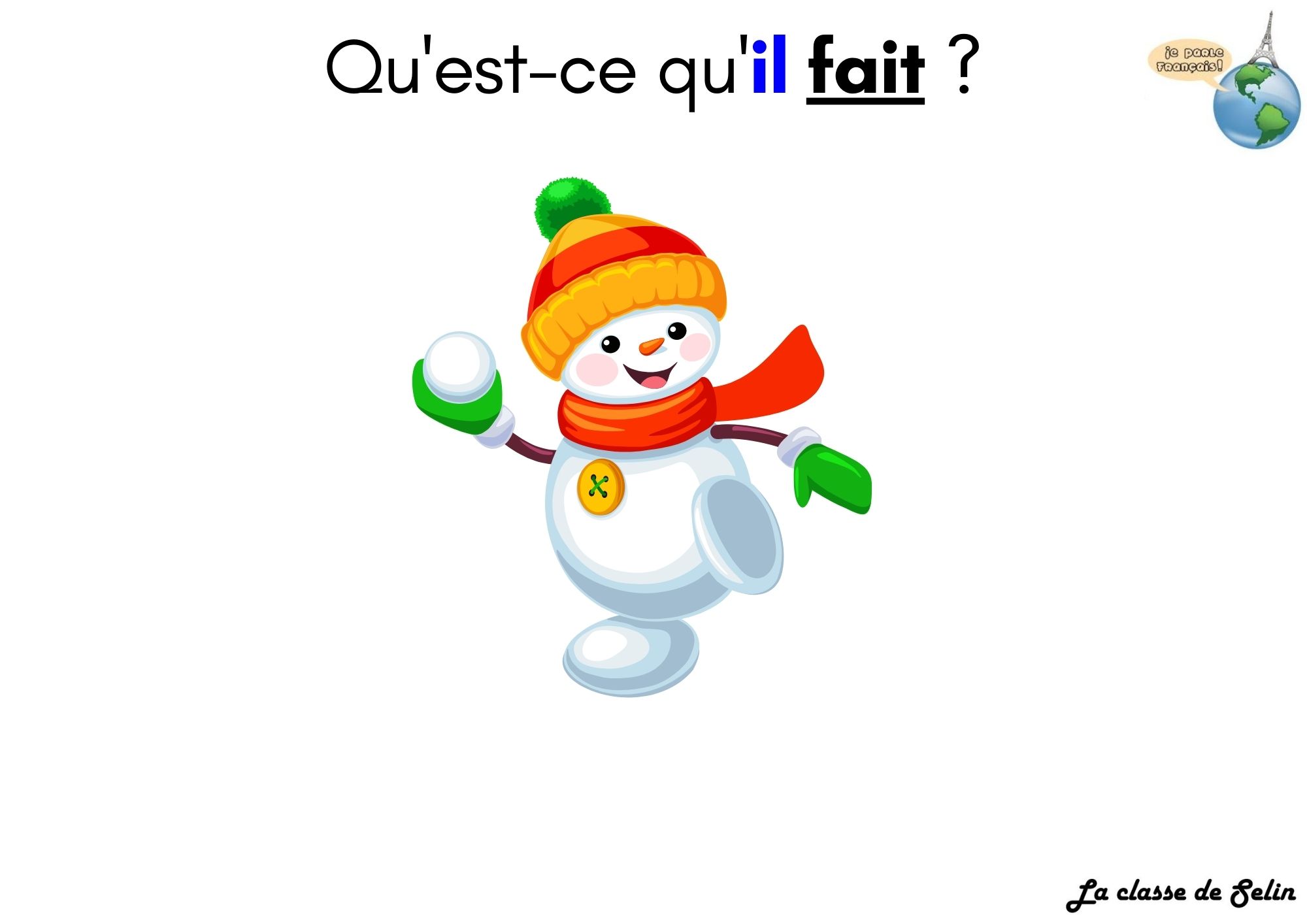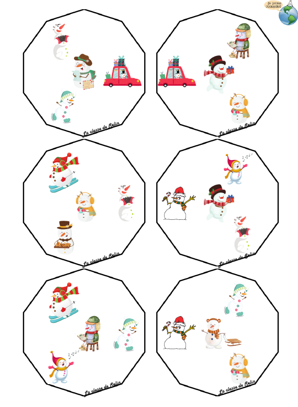 En complément de ce dossier sur les actions du bonhomme de neige, je te propose aussi un dossier pour travailler la description des bonshommes de neige et ainsi mettre l'accent sur le lexique des accessoires d'hiver (bonnet, écharpe...) et l'accord de l'adjectif de couleur tout en systématisant des structures syntaxiques comme "il porte", etc