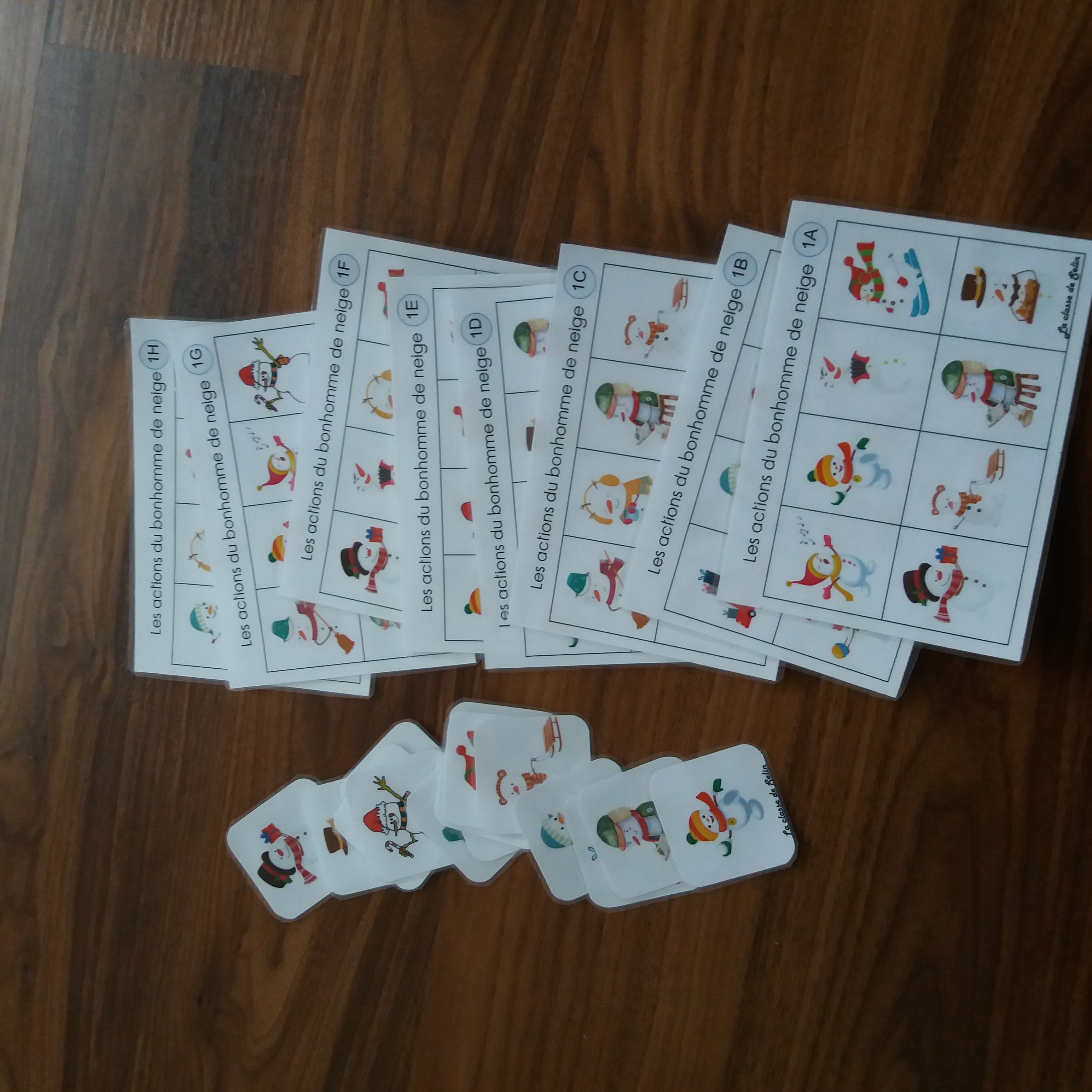 8 planches de loto avec les pions associés pour apprendre à poser la question "Qui a le bonhomme de neige qui + verbe ?" et y répondre : "J'ai le bonhomme de neige qui + verbe."
