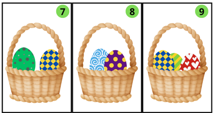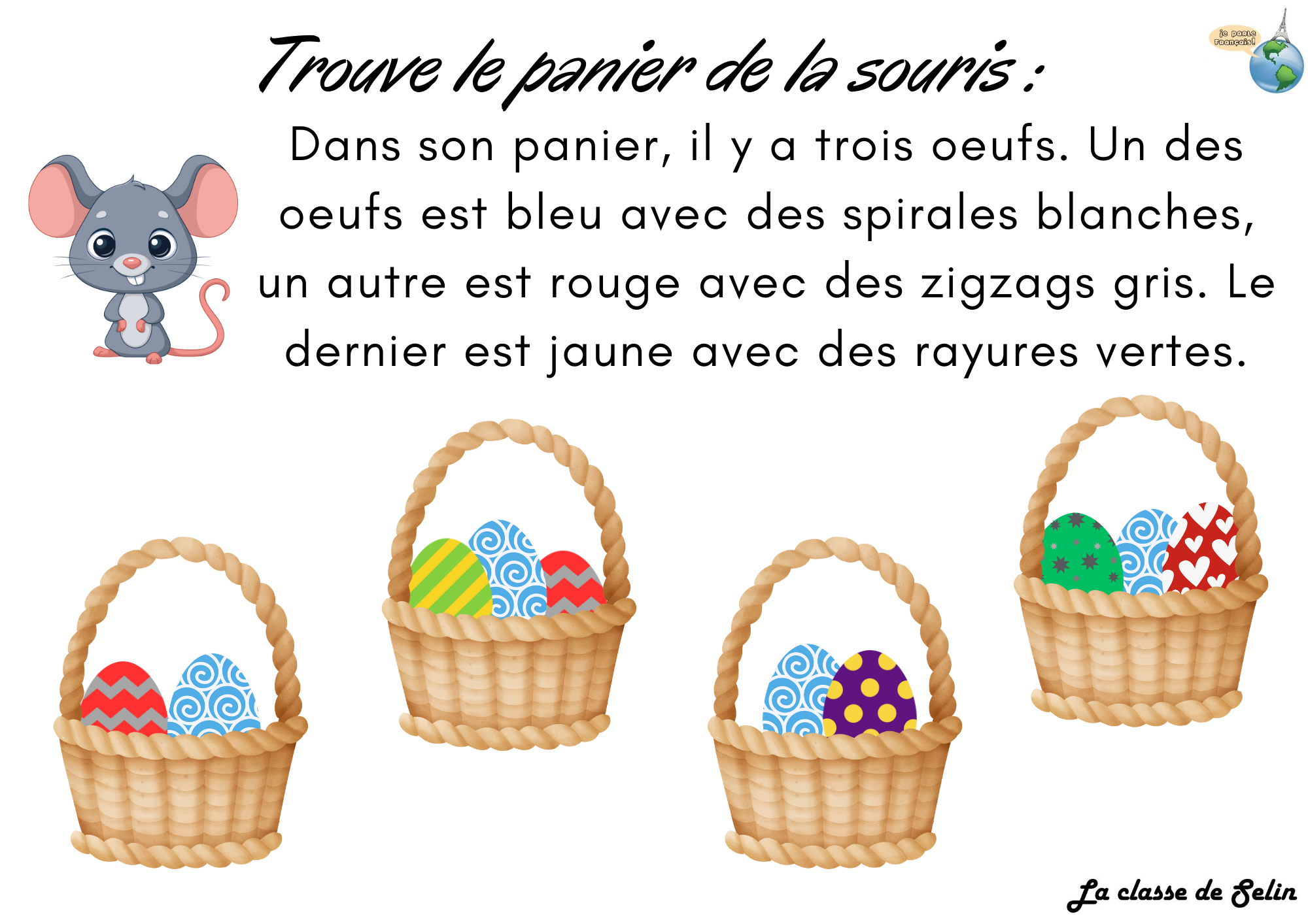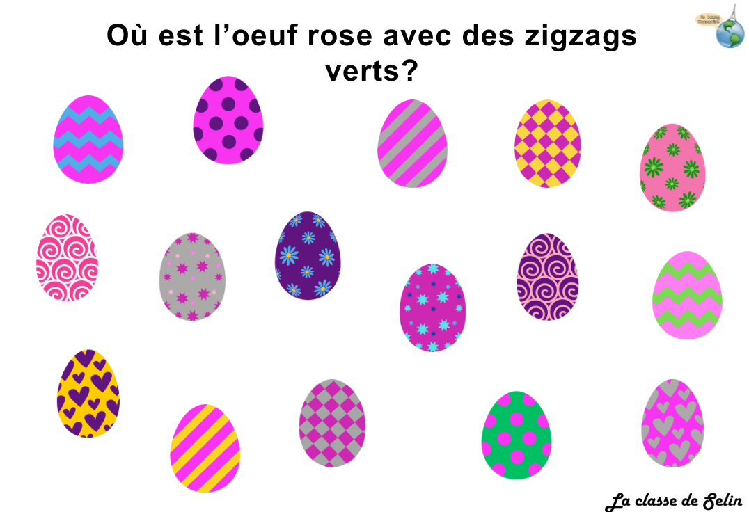 Les questions :Combien y a-t-il d'oeufs ? Est-ce qu'il ya un oeuf bleu ? De quelle couleur est l'oeuf ? Est-ce qu'il y a des coeurs ou des étoiles ? ...