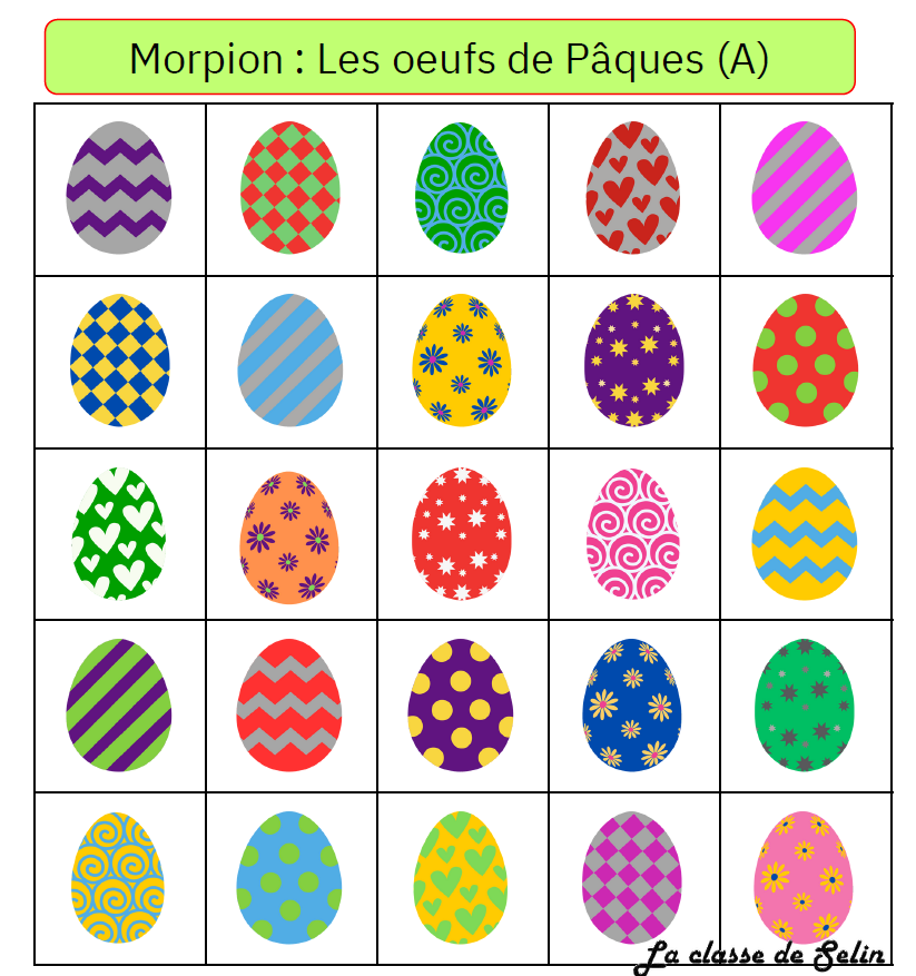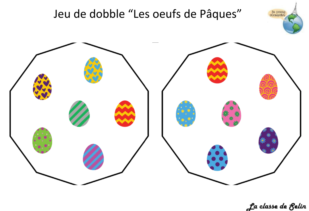 un jeu de dobble à imprimer pour trouver les oeufs identiques et une version à projeter pour s'entraîner collectivement avant