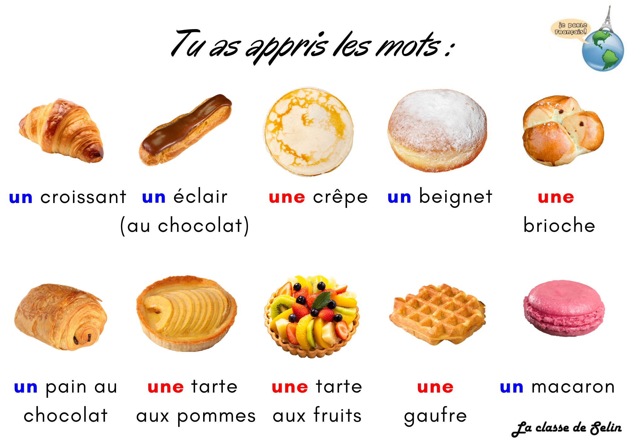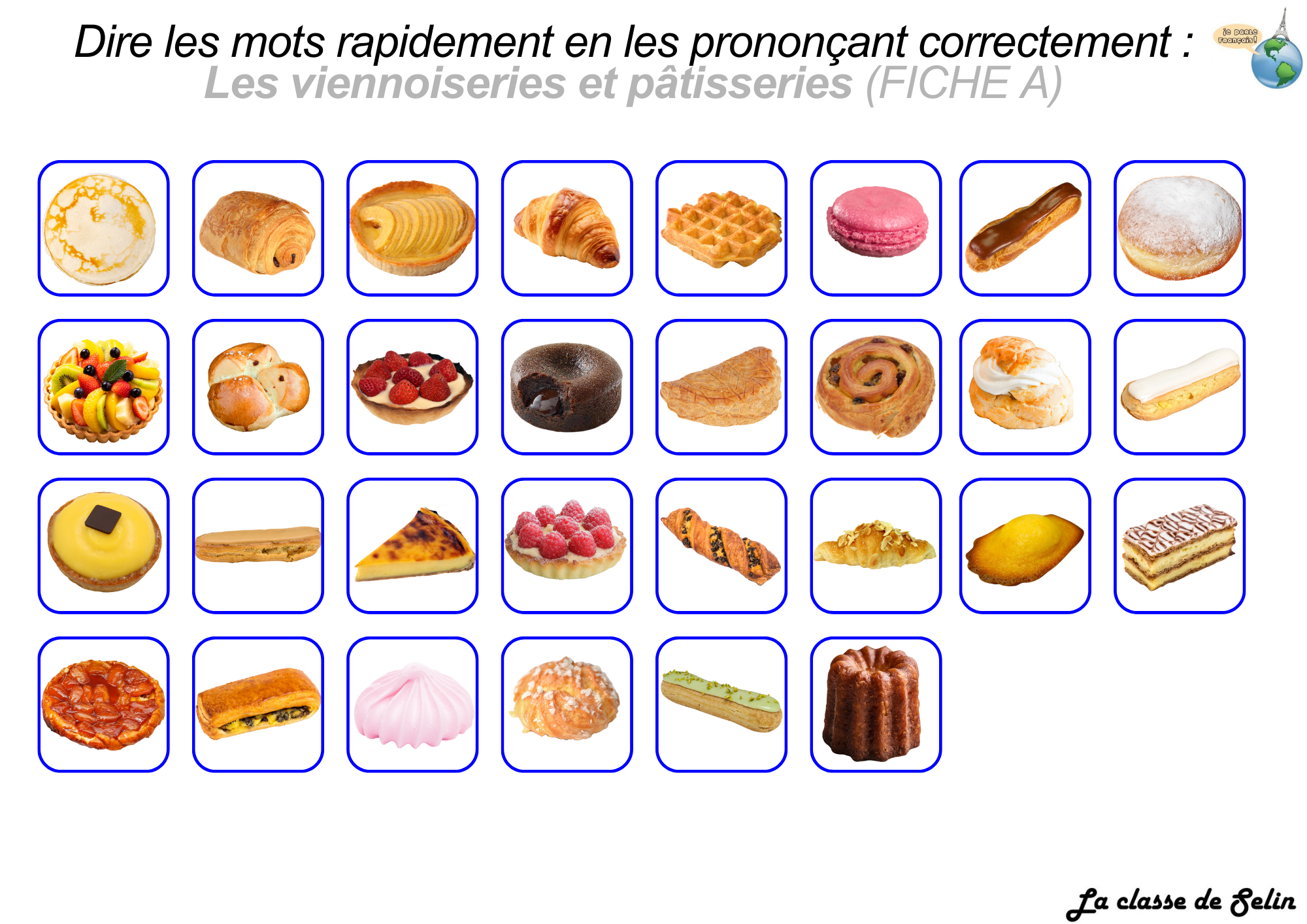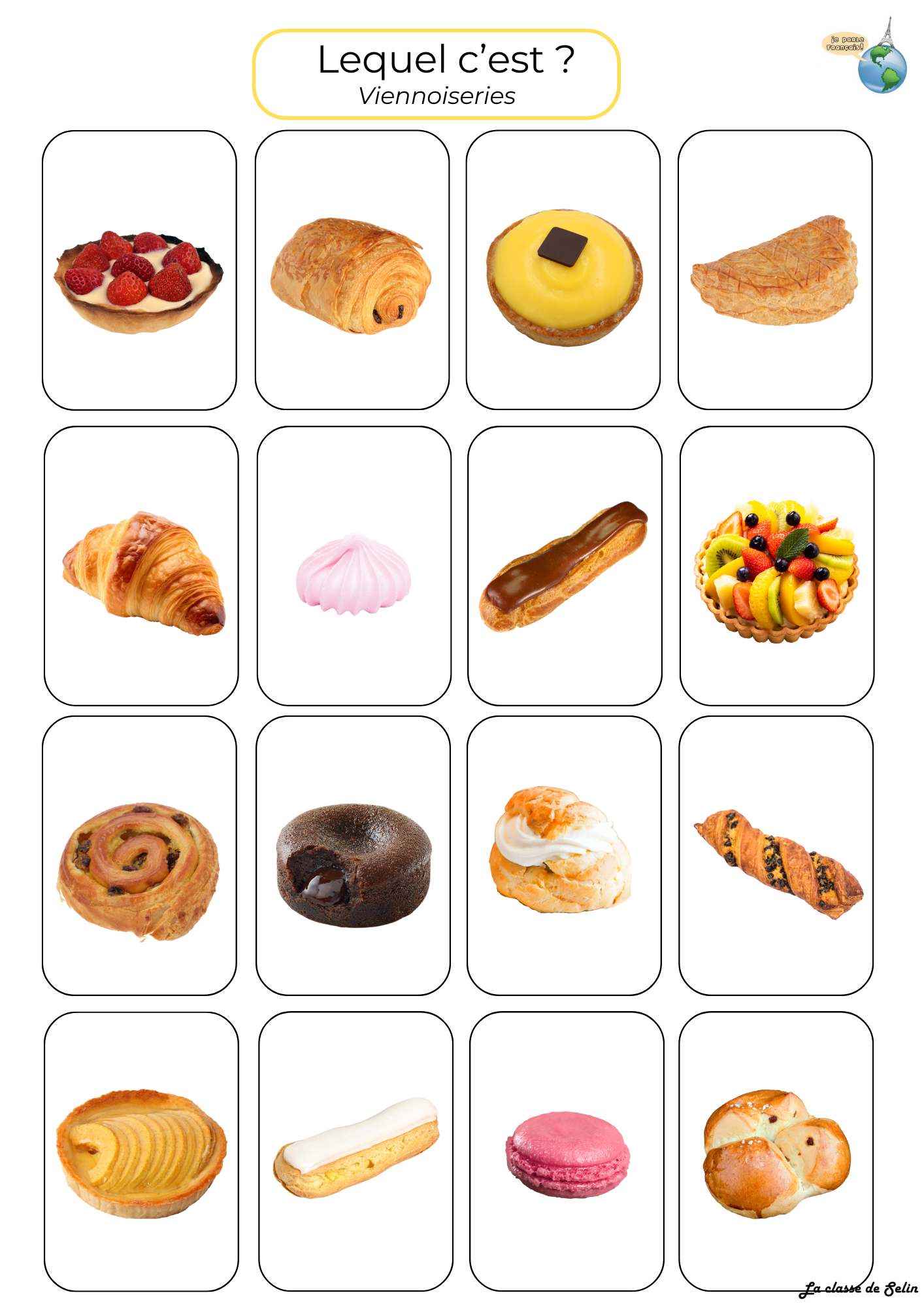 Dans ce dossier, tu trouveras différents diaporamas pour apprendre le lexique des viennoiseries et pâtisseries et l'utiliser dans des phrases :