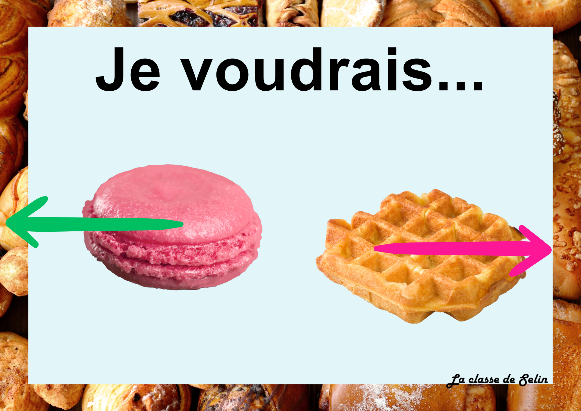 Un diaporama pour chaque niveau. J'ai choisi la structure "je voudrais" plutôt que "je préfère" car les élèves n'ont probablement jamais goûté toutes ces viennoiseries.