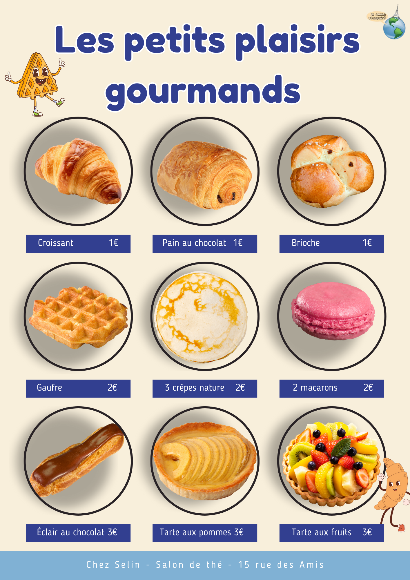 Des menus et des images des viennoiseries pour pouvoir passer commande dans le salon de thé. Le jeu de rôle permetaux élèves de réutiliser le lexique mais aussi les structures étudiées tout au long de l'année