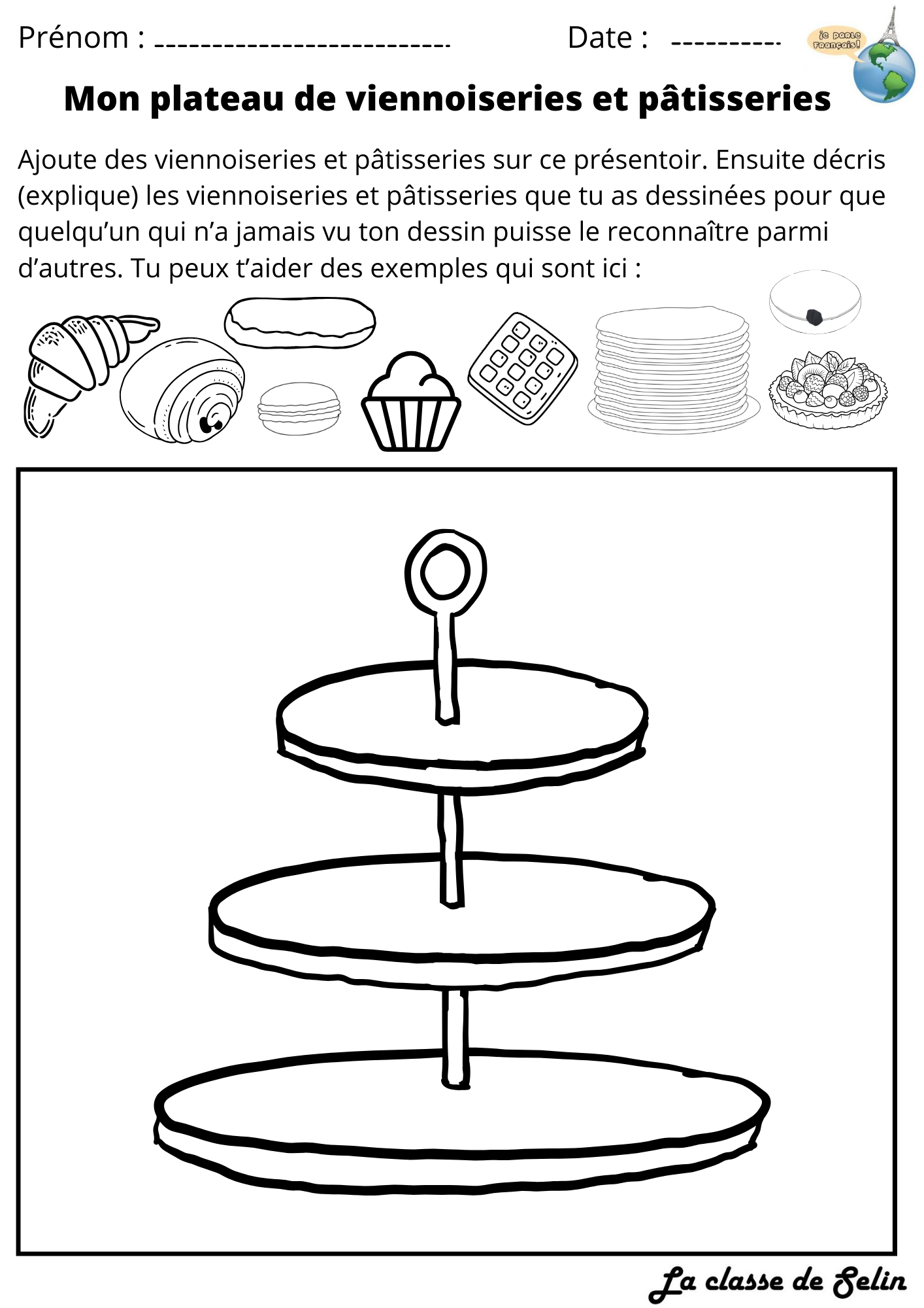 Le but de tes élèves est de dessiner (découper/coller pour les plus jeunes ou les moins doués en dessin) un plateau de viennoiseries/pâtisseries qu’ils devront ensuite décrire pour que d’autres puissent trouver duquel il s’agit